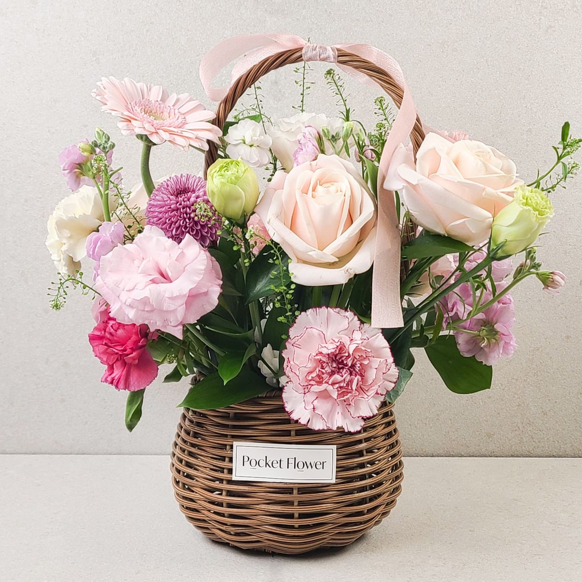 은은한 연핑크 장미와 리시안셔스, 마리포사 카네이션 등 핑크빛을 기본으로 초록빛 소재를 더해 사랑스러운 생화 원형 꽃바구니입니다. *구성: 냉이초, 소국, 스프레이 카네이션, 리시안셔스, 카네이션, 핑크 디스버드, 연핑크 장미, 원형 바구니