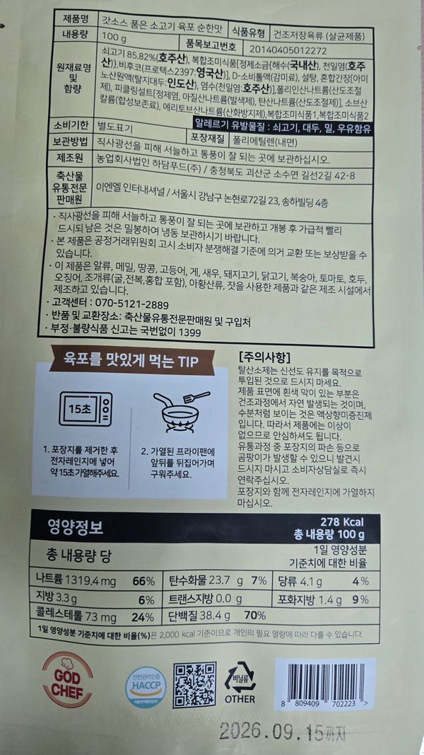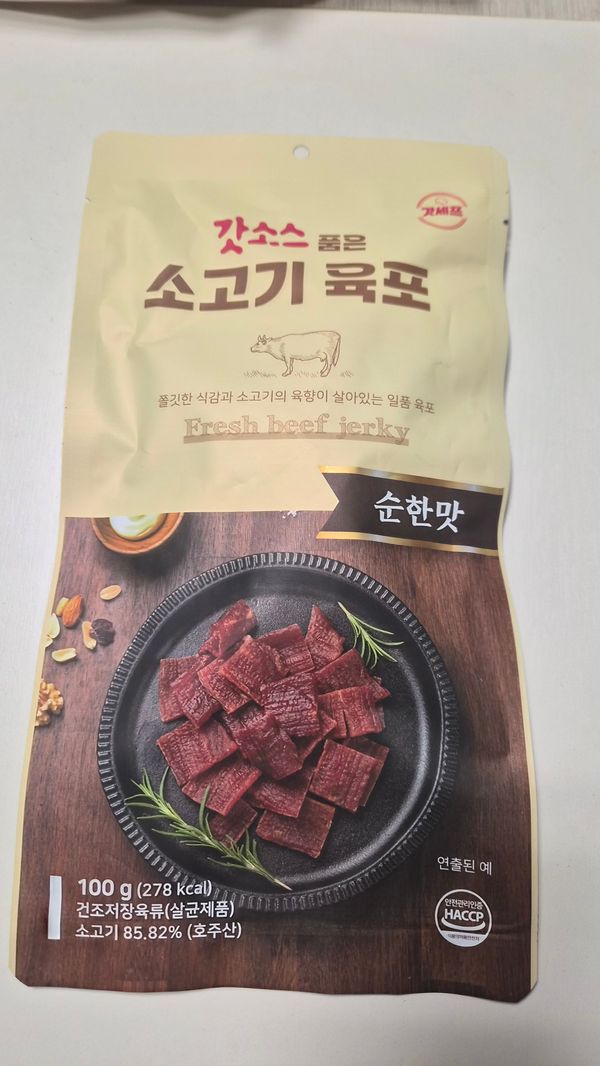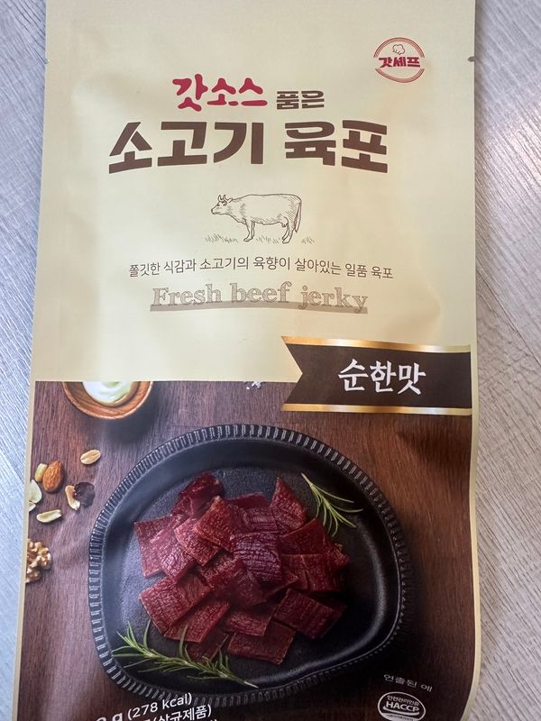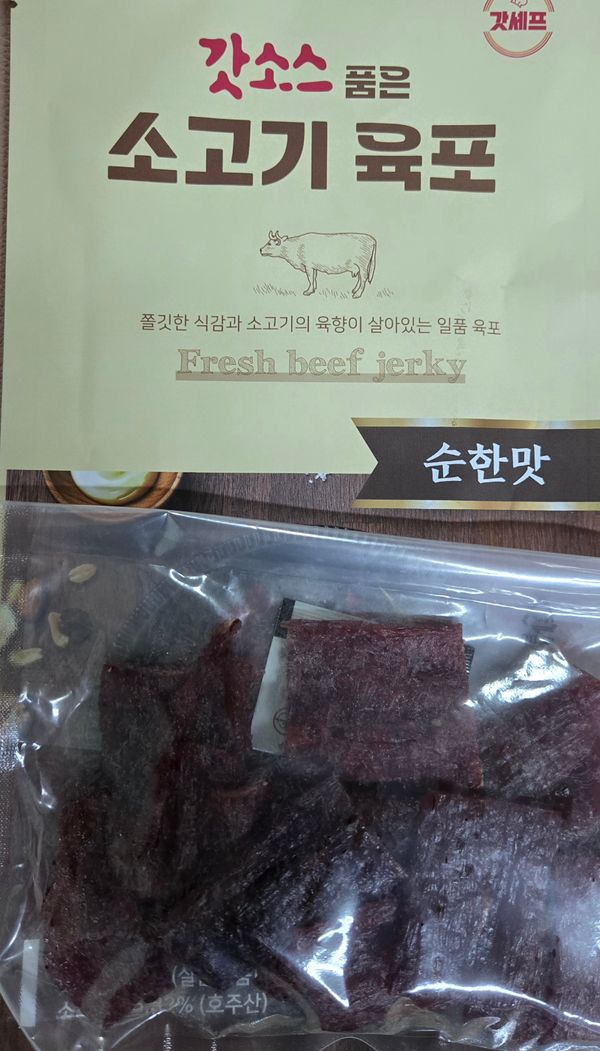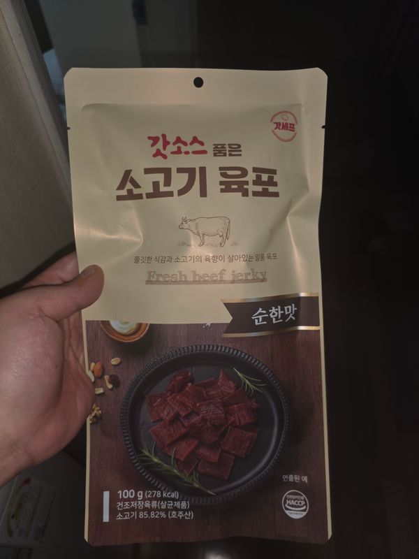 ✨ 갓소스 품은 소고기 육포(순한맛) 솔직 후기 요즘 야식 생각날 때마다 하나씩 뜯어먹으려고 갓소스 품은 소고기 육포 – 순한맛을 사봤어요. 패키지부터 깔끔하고, 양도 100g이라 적당해서 캠핑 갈 때나 집에서 간식용으로 딱이더라구요.  ✔️ 첫인상 & 포장 패키지가 은근 고급지고 심플한 스타일이라 호감 😌 호주산 소고기 85% 들어갔다고 크게 써있어서 믿음도 갔어요. 지퍼백이라 보관도 편한 점도 장점!  ✔️ 식감 & 두께 두께가 얇은편이 아니라 도톰~해서 한입 베어물면 씹는 맛이 진짜 좋아요. 다혜님이 찍은 옆면 사진 보면, 건조육포 특유의 딱딱함보다 살짝 촉촉한 느낌도 있어서 오래 씹어도 편했을 듯!  ✔️ 맛 이름처럼 ‘순한맛’이라 너무 자극적이지 않고 단짠 밸런스가 깔끔해요. 단맛이 강하지 않아서 질리지 않는 맛. 고기 향이 은근 살아 있어서 자꾸 손이 가더라구요.  ✔️ 장점  • 도톰해서 씹는 재미 GOOD  • 순한맛이라 아이들도 먹기 좋을 듯  • 기름기나 잡내 거의 없음  • 한 번 뜯으면 계속 먹게 되는 중독성 있음