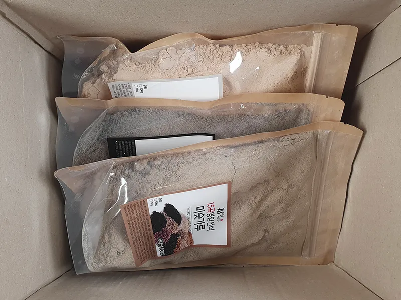 아침 식사로도 손색이 없는 영양 가득 미숫가루 입니다. 기계로 세척하지 않고 조리개를 사용하여 수작업으로 여러번 깨끗이 거르고 세척합니다. (​* 구성: 현미, 보리, 백태, 찹쌀, 서리태, 흑미 찹쌀, 수수, 귀리, 팥, 흑미, 검정깨, 흑미 찹쌀, 강낭콩, 율무, 약콩)