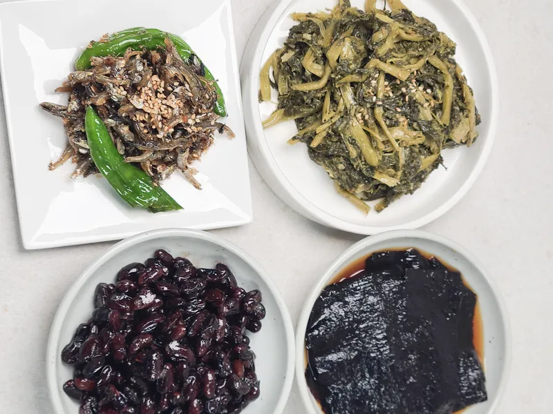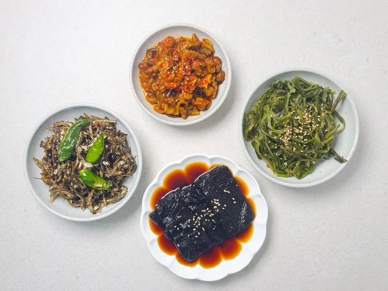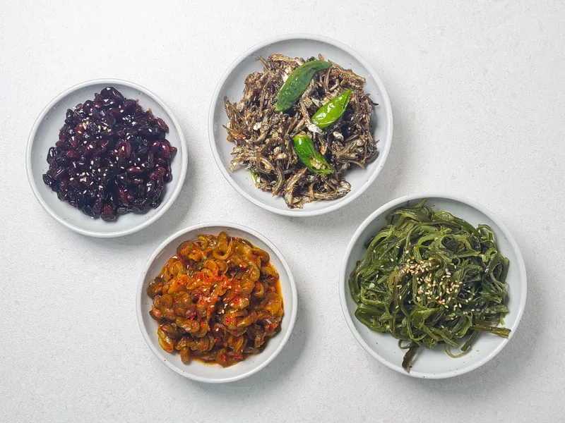 오이지무침 : 아삭한 식감과 산뜻한 짭조름함이 입맛을 돋워주는 맛이에요. 김 장아찌 : 잘 숙성된 양념이 배어 깊고 구수한 감칠맛이 나는 별미죠. 미역줄기볶음 : 바다향 가득한 미역줄기에 담백한 간이 어우러져 깔끔하답니다. 꽈리고추 멸치볶음 : 고소한 멸치와 알싸한 꽈리고추가 어우러져 씹을수록 풍미가 살아나요.