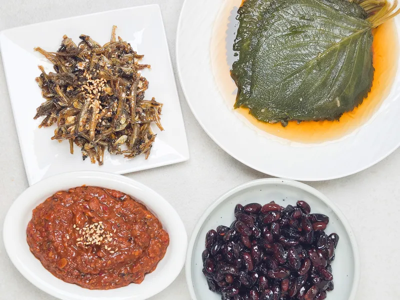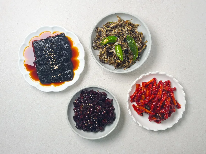 무말랭이 : 쫄깃한 식감과 매콤달콤 양념이 어우러져 씹을수록 감칠맛이 살아난답니다. 김 장아찌 : 잘 숙성된 양념이 배어 깊고 구수한 감칠맛이 나는 별미죠. 콩자반 : 윤기 흐르는 콩알마다 달짝지근한 간장이 스며 고소하답니다. 꽈리고추 멸치볶음 : 고소한 멸치와 알싸한 꽈리고추가 어우러져 씹을수록 풍미가 살아나요.