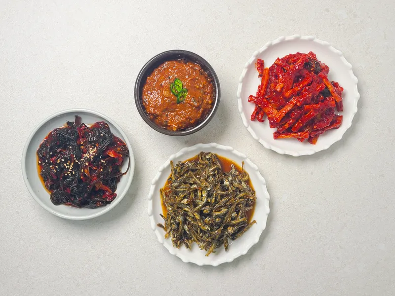 약고추장 : 진하게 졸인 고추장의 매콤 달콤함이 밥 비벼 먹기 딱 좋은 맛이에요. 고추장 멸치볶음 : 짭조름한 멸치에 매콤한 고추장이 배어 자꾸 손이 가는 밥도둑이죠. 콩자반 : 윤기 흐르는 콩알마다 달짝지근한 간장이 스며 담백하면서도 고소하답니다. 미역줄기볶음 : 바다향 가득한 미역줄기에 담백한 간이 어우러져 깔끔하답니다.