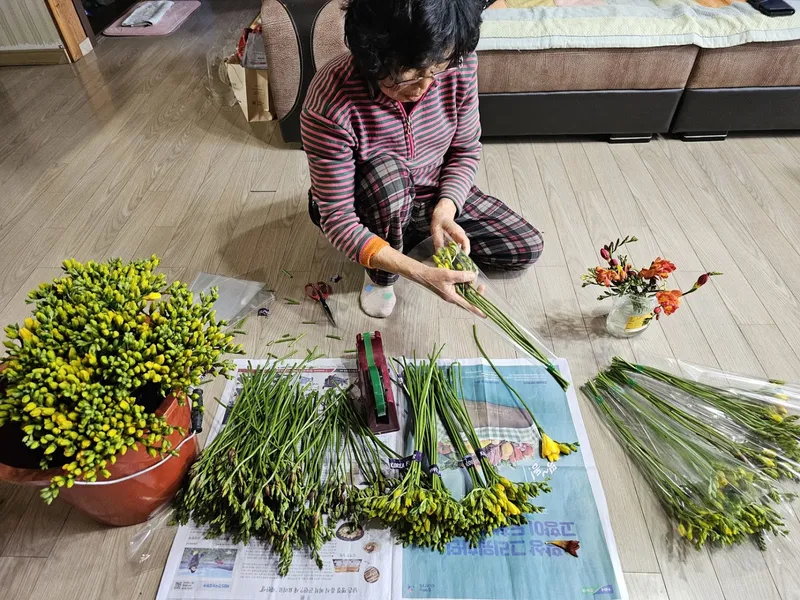 충남 서천에서 10년째 프리지아를 재배하고 있어요. 직접 만든 천연 비료를 사용하며, 튼튼한 1번 2번 꽃가지로 수확하여 보내드려요.