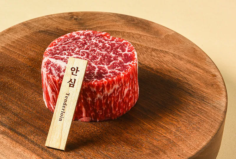 안심은 채끝 안 쪽에 있는 부위이며 운동량이 많지 않아 고깃결이 곱고 지방이 적어 담백합니다. 마블링이 적어 오래 굽지 말고 빠른 시간에 조리하는 것이 좋습니다.