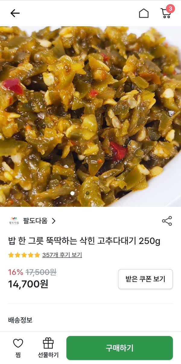 1주일전에 먹어보고 맛있어서 이번에 또 구매했습니다. 너무 맵지도 않고 깔끔한 맛이 너무 좋네요^^