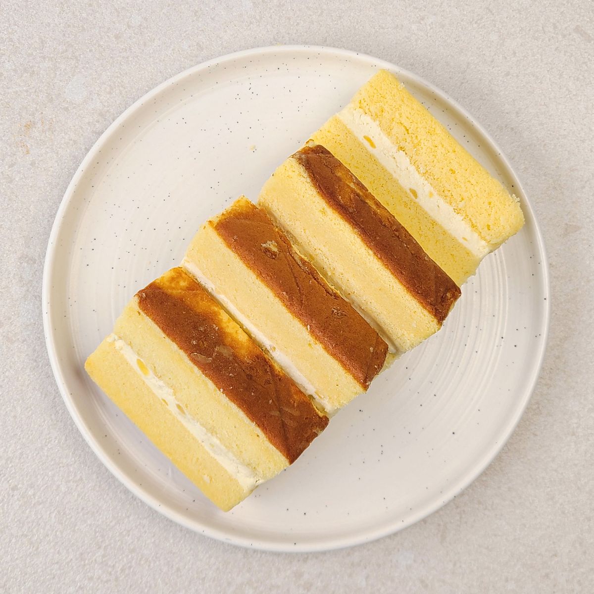 부드러운 식감의 쌀케이크 시트에 부드럽고 달콤한 크림과 고구마 알갱이가 콕콕!