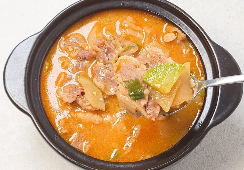 고기 국물의 구수함과 진한 감칠맛을 담았어요. 고소하고 부드러운 식감의 우삼겹과 쫄깃한 스지를 사용해 재료들이 조화를 이룹니다. 깊고 진한 맛으로 밥도둑 역할을 해주는 된장찌개예요.