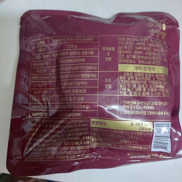 투병생활 하다보니 주로 햇반을 먹거나 영양밥을 먹고 있는데ᆢ신뢰가 가는 셰프의 메뉴라서 구매 했어요 맛있어요 다만 한끼로서 용량이 약간 적어요 그래서 별표 하나 뺐어요 그러나 밥은 맛있어요 ^^