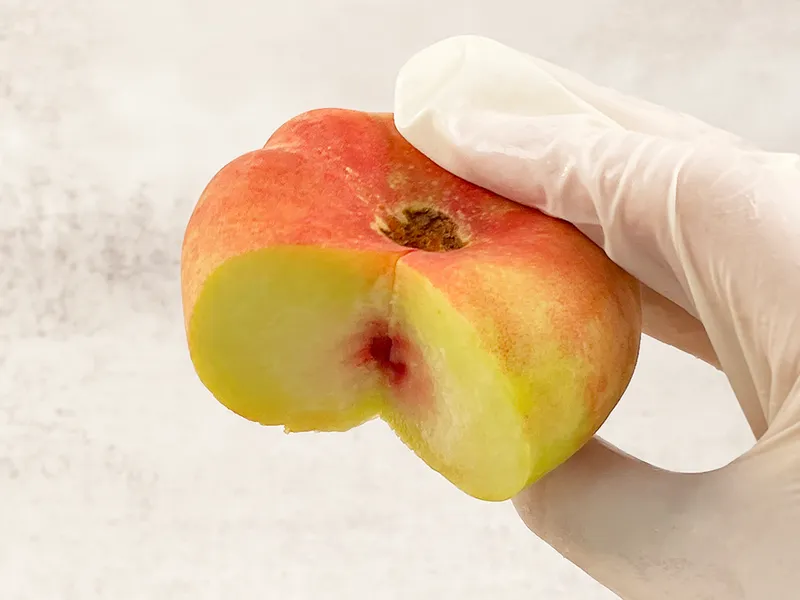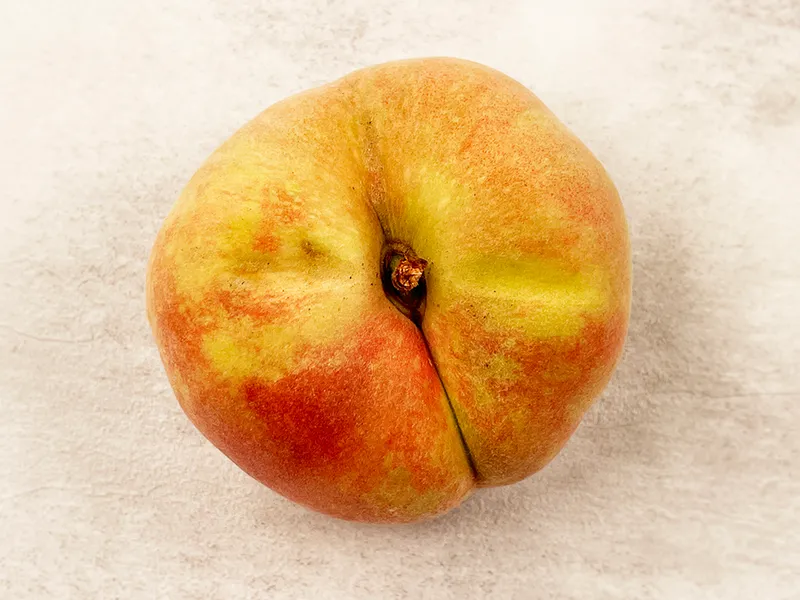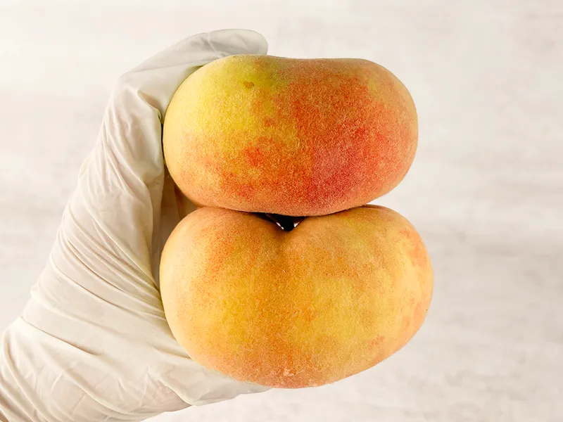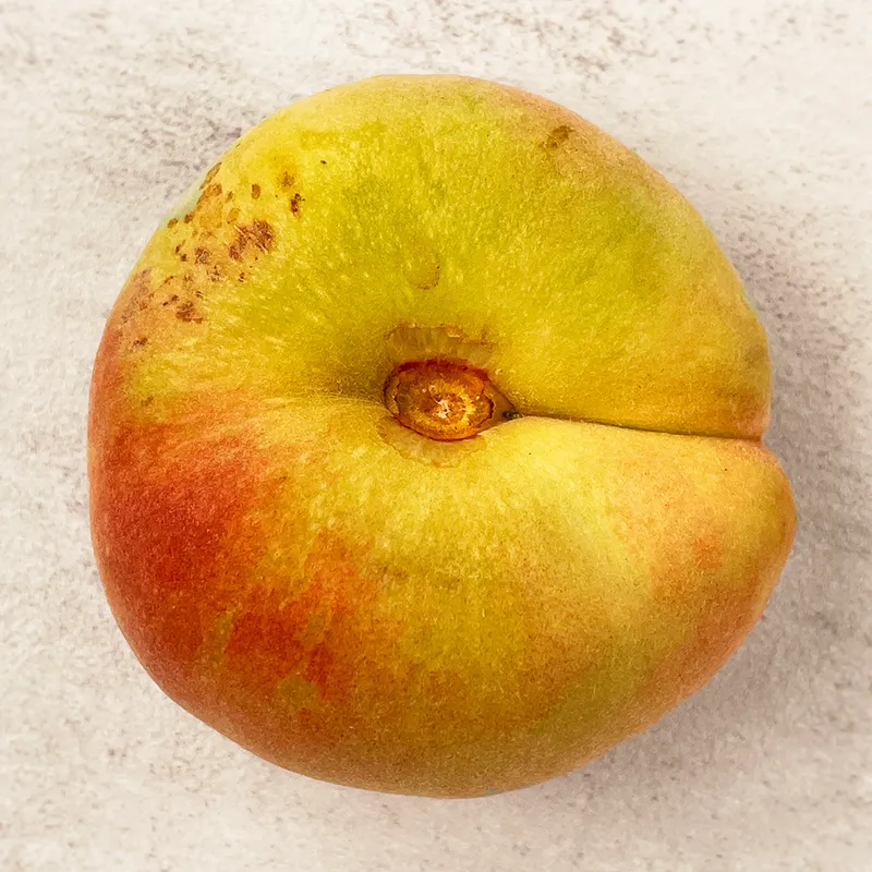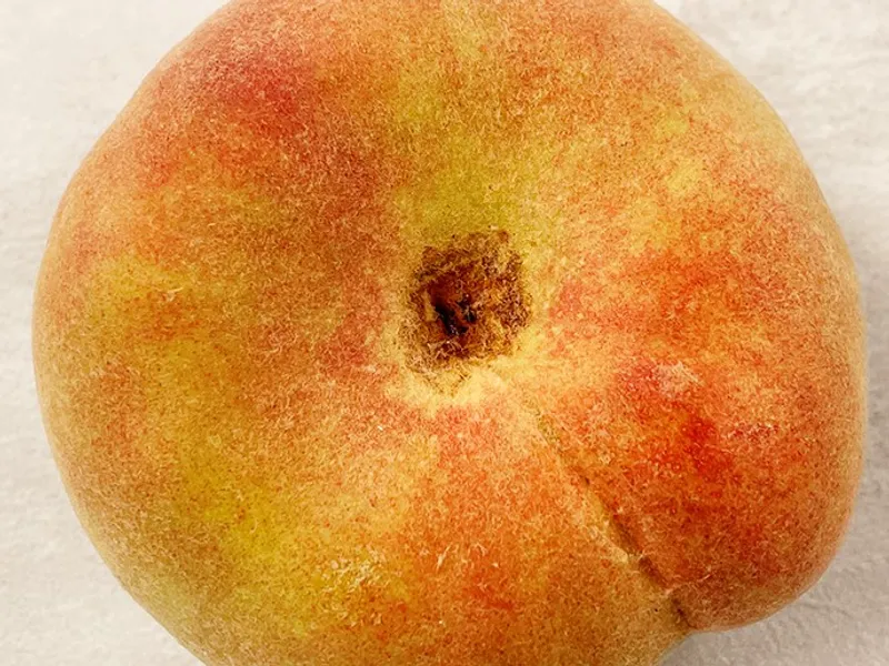 거반도 납작복숭아는 품종 특성상 꼭지 부분에 갈라짐이 발생할 수 있습니다. 이는 상품 이상이 아니며 우리나라 기후 특성상 납작복숭아 품종에서 흔히 일어나는 현상 중 하나입니다.