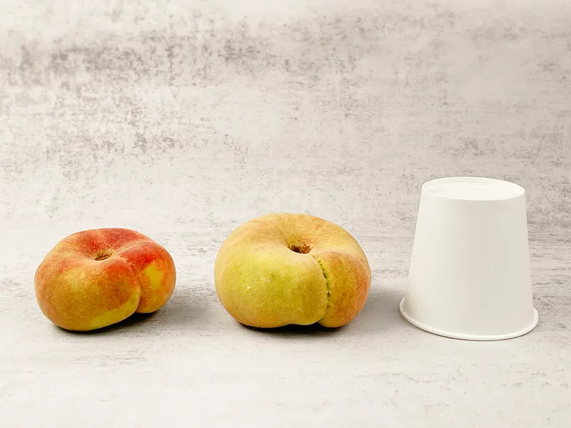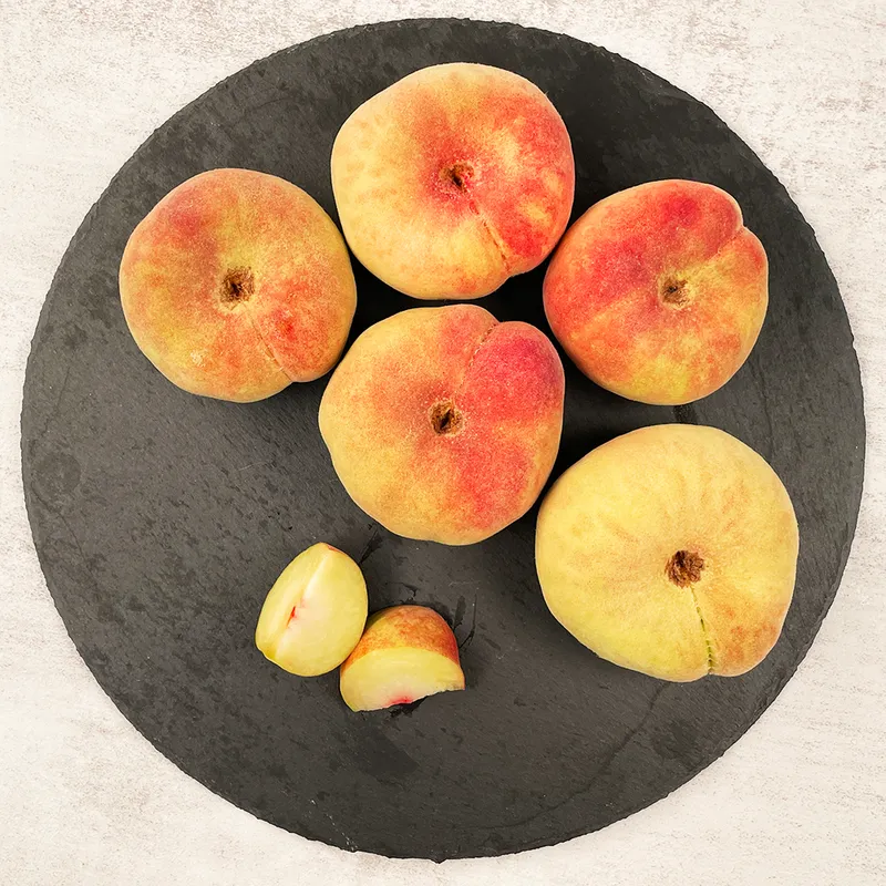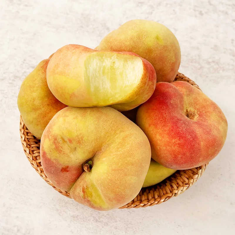 납작복숭아라는 이름답게 납작해서 한 손에 들고 베어 먹기도 편하답니다. 처음에는 살짝 단단하게 느껴질 수 있지만 후숙할수록 당도가 올라옵니다!