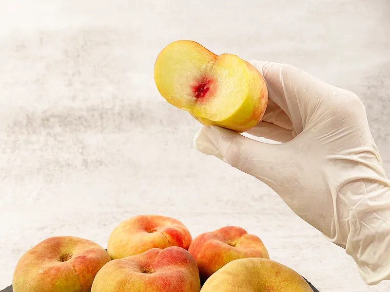 납작복숭아는 일반 복숭아에 비해 약 1브릭스 정도 높아 달콤하면서도 쫀득~한 식감을 자랑합니다. 한입 베어무는 순간 향긋한 과즙이 입안 가득 퍼집니다.