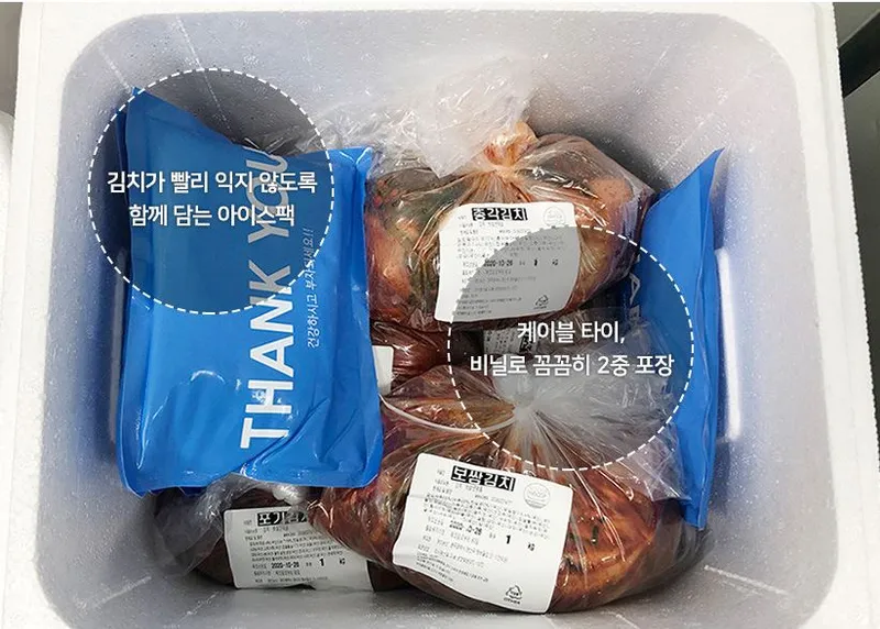 국물이 새지 않도록 케이블타이와 비닐로 꼼꼼히 포장하여 보내드립니다.