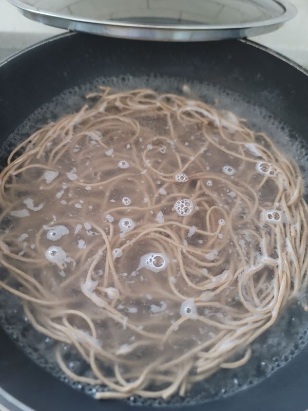 1. 끓는 물 1200cc에 메밀면 1인분(약 167g)을 넣고 약 5-7분 정도 끓여 주세요.