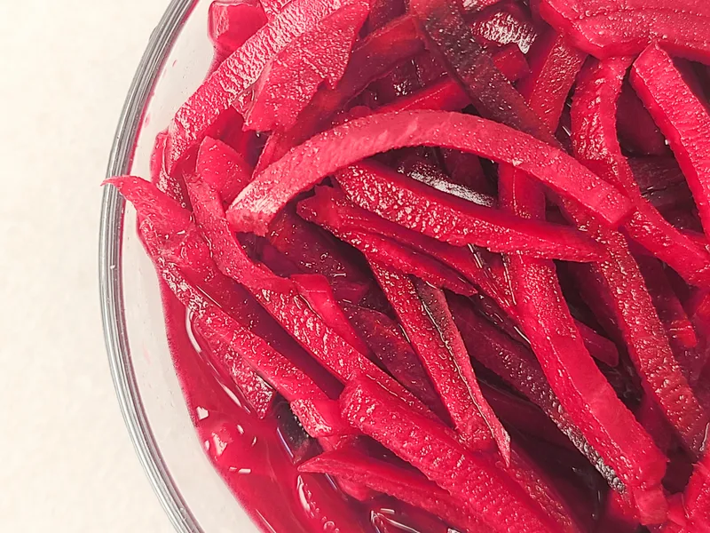 비트 특유의 깊은 맛이 느껴져요. 양배추보다 부드럽고 촉촉합니다. 선명한 빨간색 빛깔이 입맛을 더욱 돋워주죠. 살짝 특이할 수 있지만, 먹다 보시면 비트의 매력에 깊이 빠져들게 되실 거예요.