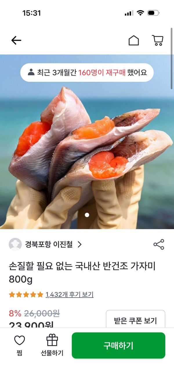 상품평보고 처음구입했는데 맘에 쏙 듭니다 깨끗한 손질. 반건조라서 더욱. 맛있겠어요 알도 다 들어있고. 만족! 또 주문할게요