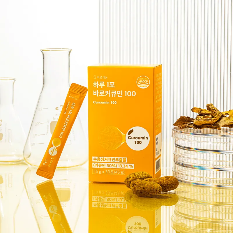 커큐민은 원래 지용성 원료로 물에 녹지 않습니다. 입자도 커서 흡수율이 떨어지죠. 바로커큐민100은 높은 흡수율을 위해 특수 가공된 수용성 원료로 만들었습니다. 적은 함량으로도 충분히 섭취할 수 있어요.