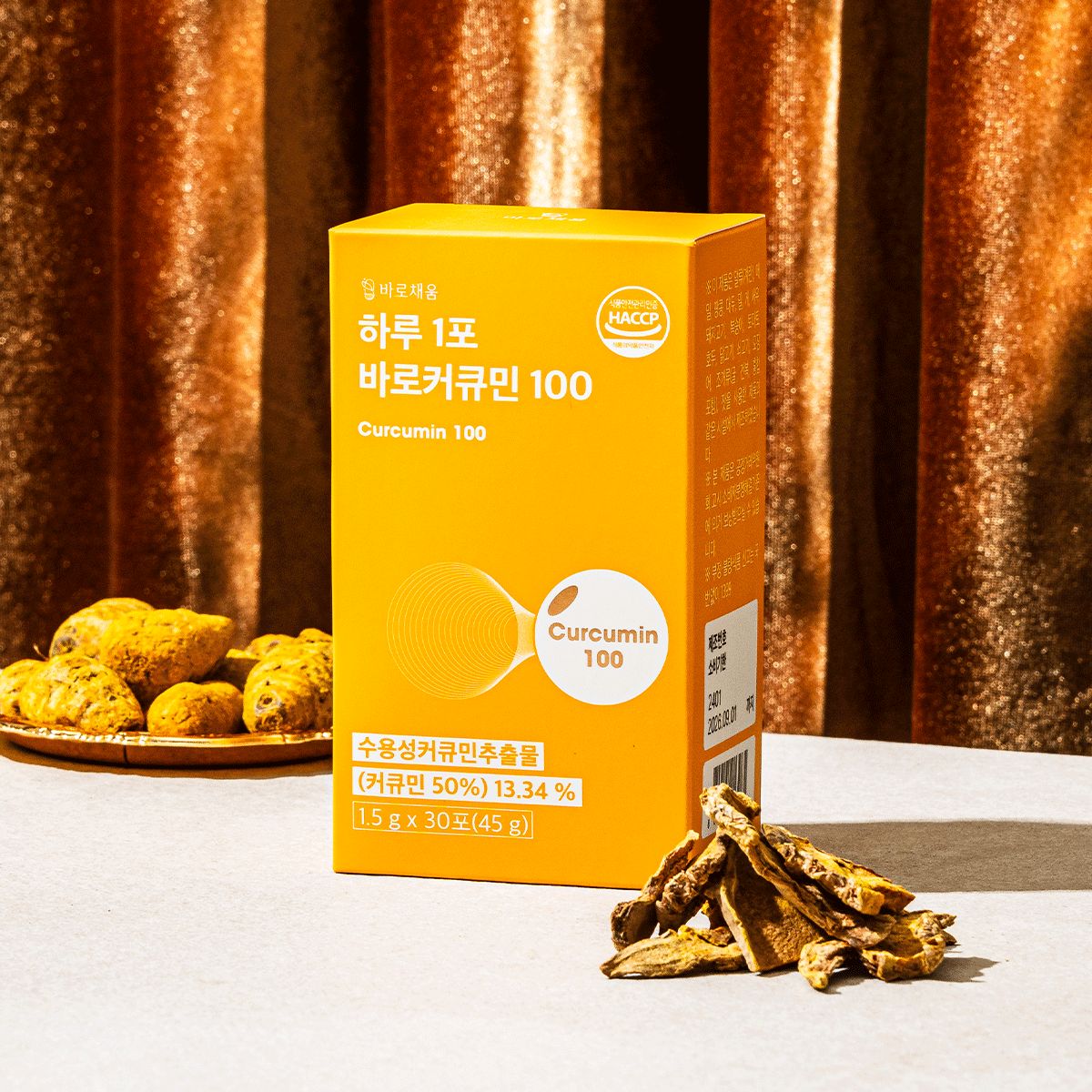 '바로채움 하루 1포 바로커큐민100'은 치료나 예방 목적의 의약품이 아닌 '식품'입니다. 질병이나 그로 인한 증상이 있는 경우, 의사 등 전문가와 상의하세요.
