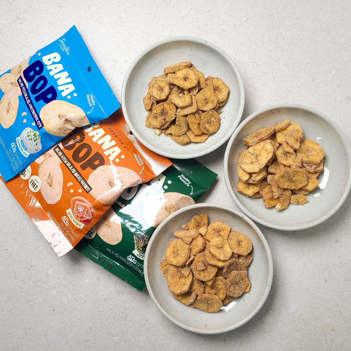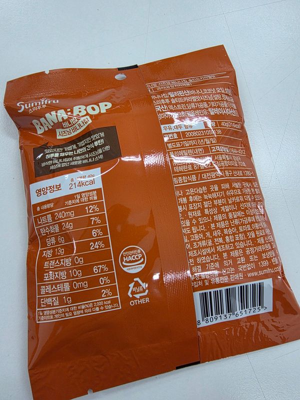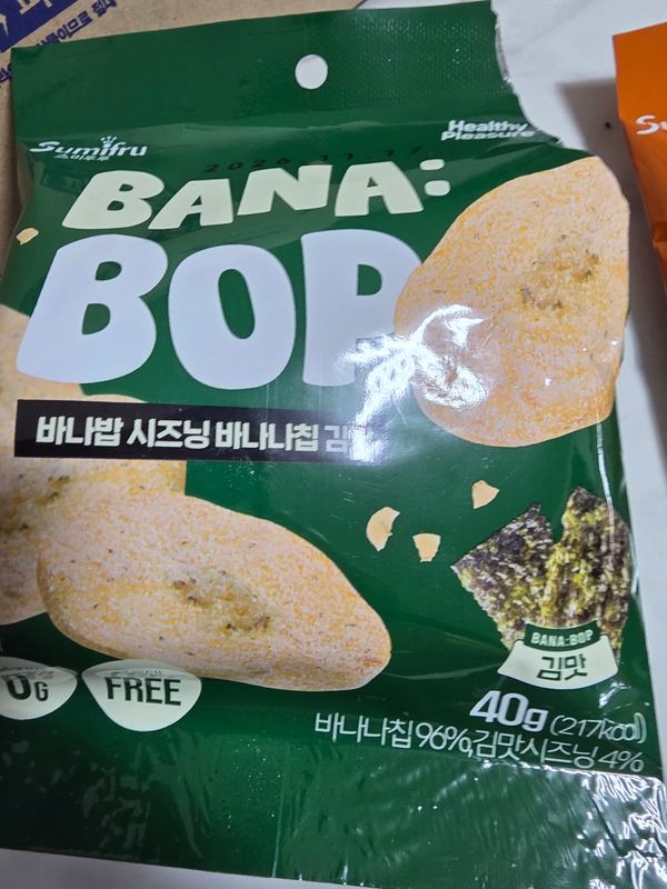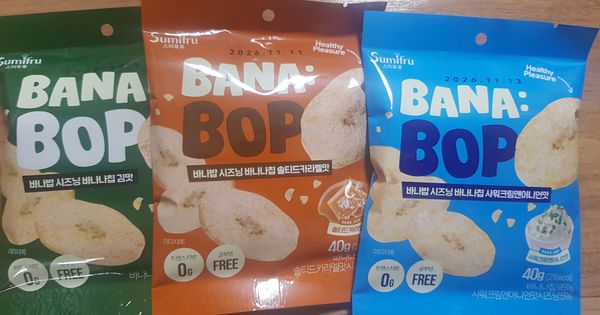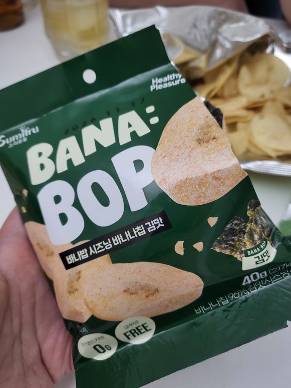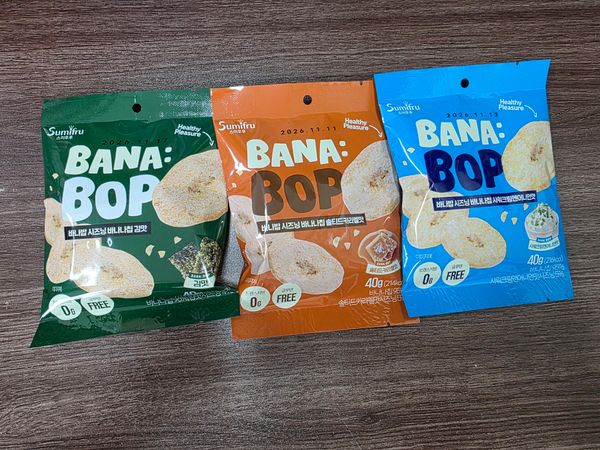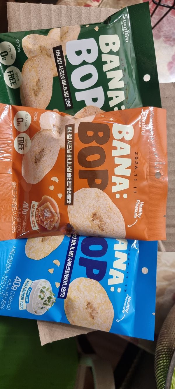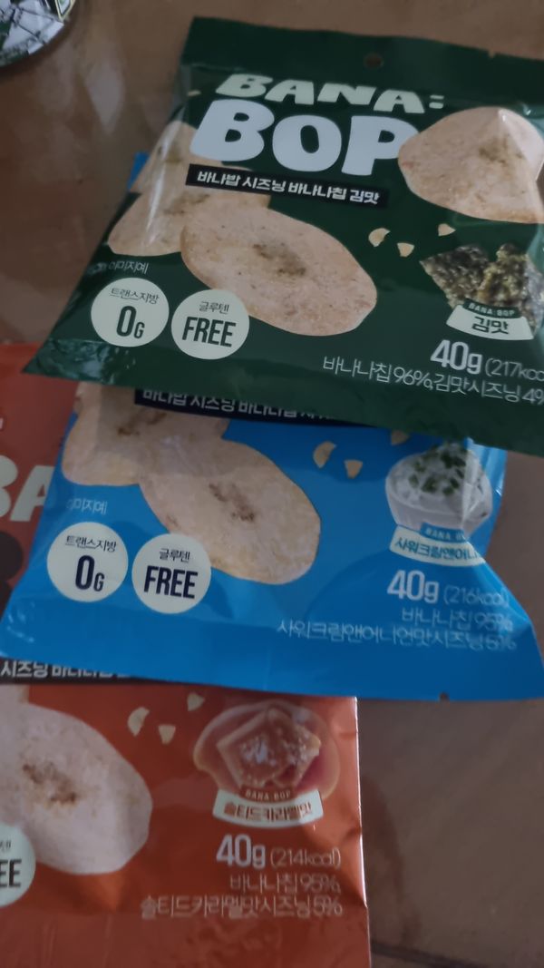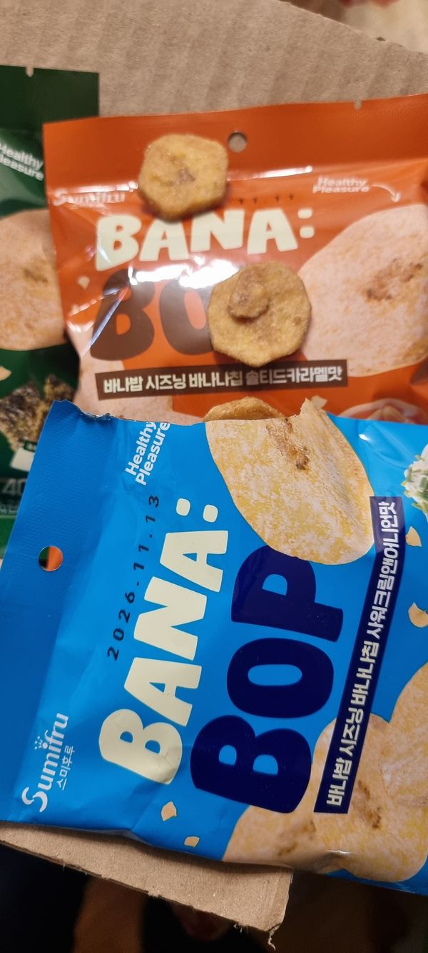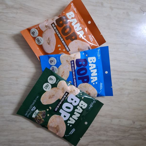기존 알고 먹던 바나나칩에 시즈닝이 더해져선 맛이 두배!!^^ 바나나칩을 좋아해선 종종 사먹는 편인데 시즈닝 더한 바나나칩 어떤맛일까싶어선 구매했어요!! 와우~한입 먹는 순간 빠져버리게 되는 이 현상은 무엇인지...여태껏 알고 지냈던 달콤한 바나나칩의 대변신이랄까~~김맛은 짭조름하면서도 바삭바삭핫 식감에 계속 손이 가네요!!^^ 샤워크림앤어니언맛은 애들이 정말 좋아하는 맛인듯 아들넘 맛있다고 너무 잘먹네요~ 솔티드 카라멜 맛 또한 바나나칩과 카라멜의 단짠 조화가 굿굿굿!!^^ 튀기지않고 굽듯이 건조해서 원물간식처럼 담백하게 즐길수 있어선 더 손이 가는 바나밥 칩 추천하고 갑니다!!