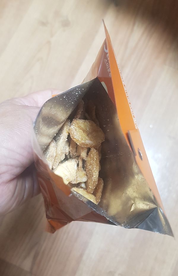 와웅~바나나로 이렇게 맛있는 과자를 만든 다는게 신기 하네요 우선 캬라멜 맛 바나나칩 먼저 먹었는데 봉지 뜯는 순간 달콤한 캬라멜 향이 쏟아지듯 퍼지는데 너무 향이 진하고 달콤해서 기분이 좋았어요 맛은 더 일품 이구요 그냥 간식으로 먹어도 너무 좋치만 맥주 안주로 하면 더 좋을거 같아요 바삭바삭 부드러운 달콤한 맛입니다