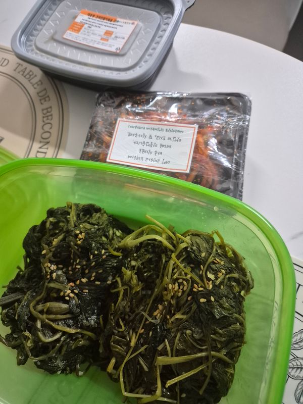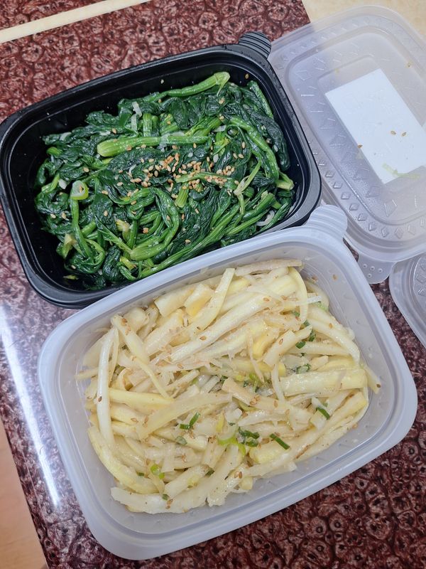 고추장은 안오고 그냥 시금치 나물난 왔네요. 좀 덜 삶아진거 같고요.고추장 무침대신 그냥 나물로 더 왔겠죠?