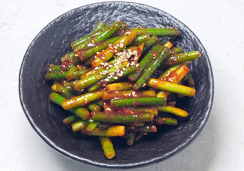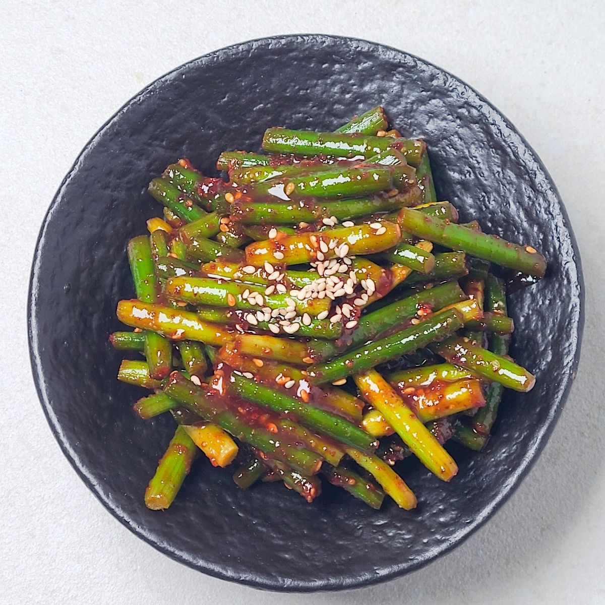 아삭아삭한 마늘쫑을 정성껏 골라 풍미 깊게 만든 반찬이에요. 뽀득뽀득한 식감과 깊은 맛을 담아 씹는 재미를 더한 접시를 선사합니다.