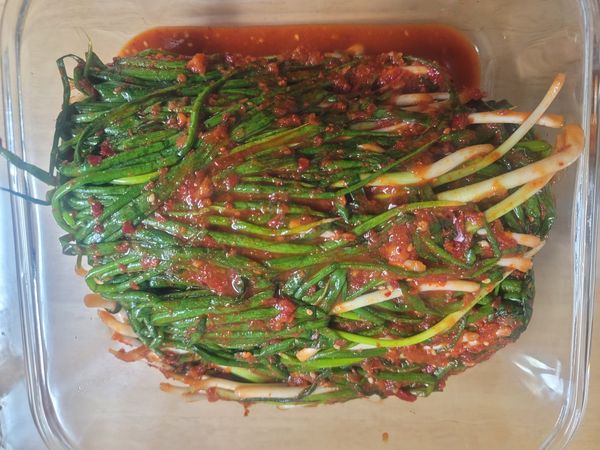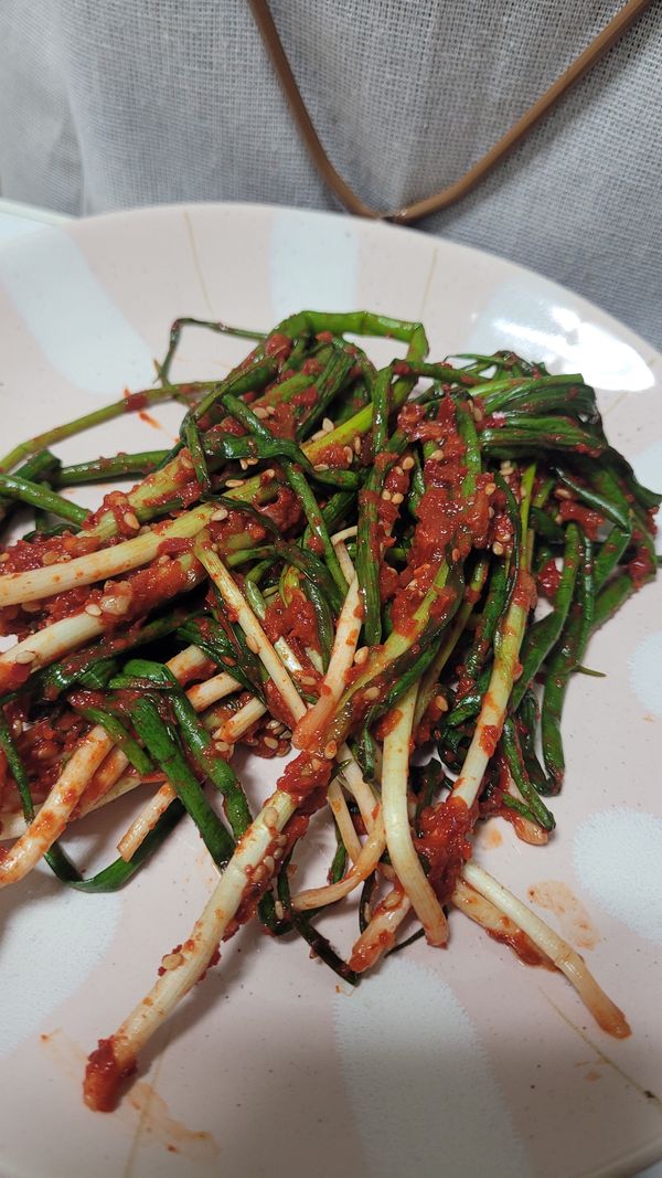 가느다란 파로 맛나게 담근 파김치 정말 맛있게 먹습니다 간도 슴슴해서 좋구요. 재주문 의사 있어요