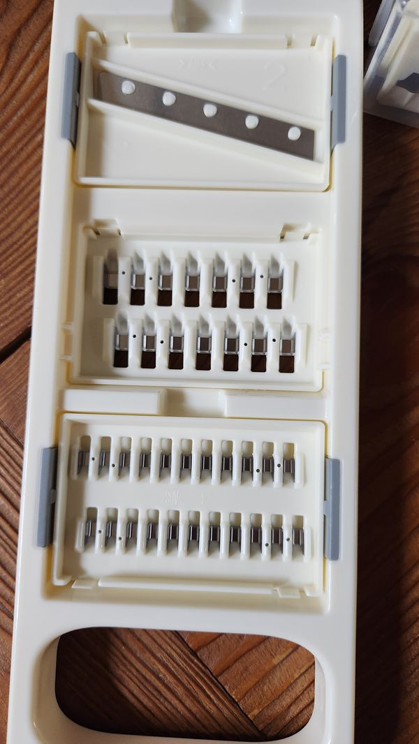 채칼 잘 받았습니다 다양한 용도로 사용할 수 있어서 좋고 자주 사용하는 거는 뒷쪽에 보관해 둘 수 있어서 그 또한 좋습니다 사용하는 앞쪽이 스텐레스여서 그 점도 좋아요 다만 굵은 채칼로 무채를 해봤는데 굵지가 않아요 그게 아쉽습니다
