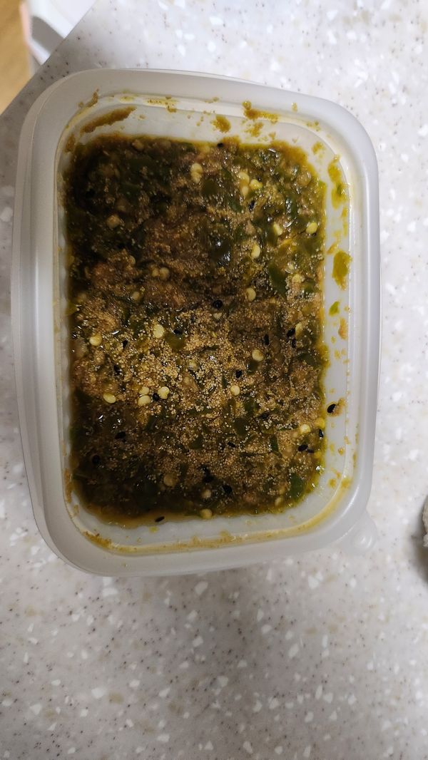 먹을수록 입 안에 여운이남는 고추다짐이네요 삭힌고추인듯 검은 빛깔이 거부감 들지만 먹어보면 맛있네요 표시사항이 없는제품을 판매해도 되는건지 궁금하긴하네요