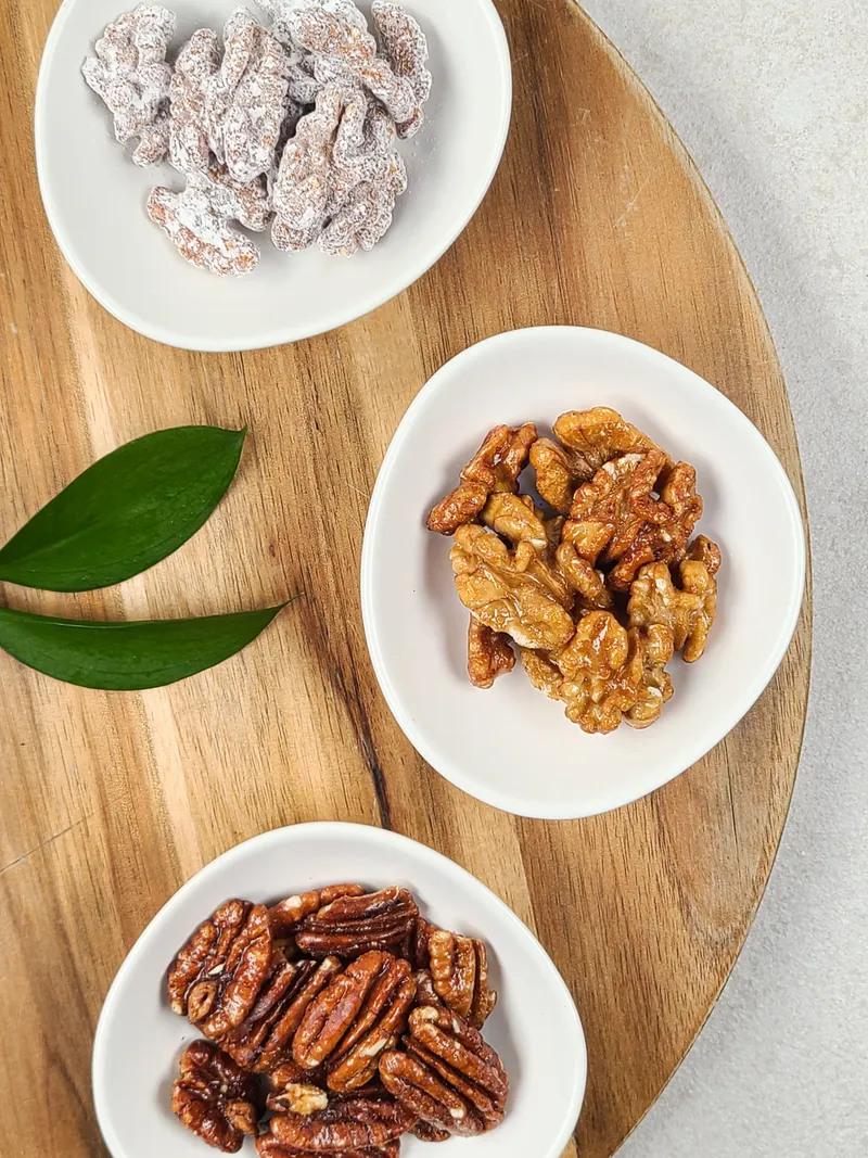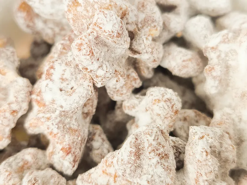 슈가파우더를 뿌려 더 부드럽고 달콤해진 눈꽃호두정과입니다.