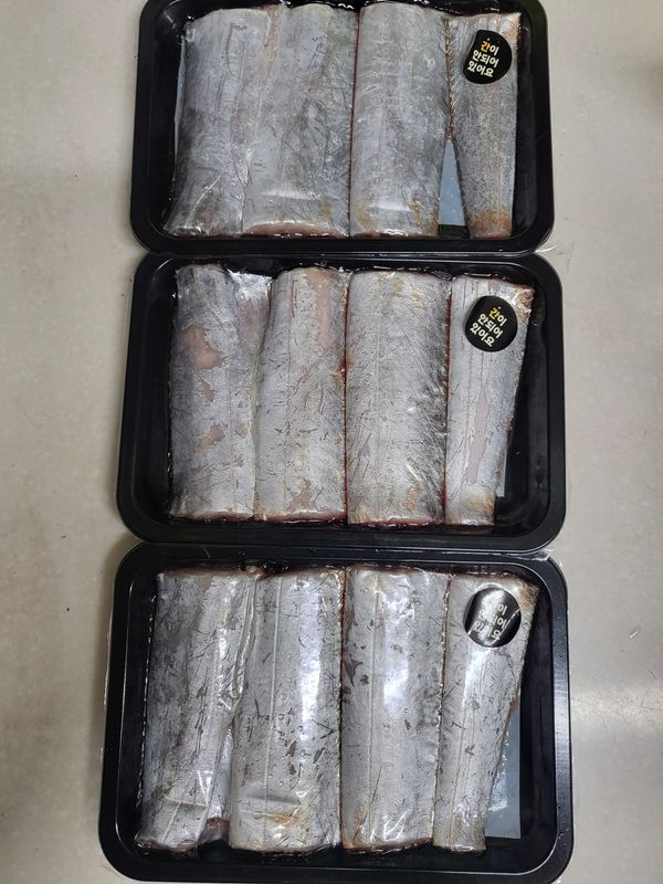 제 최애 생선제품입니다 도착해서 꺼내보고 감탄했어요 싱싱한 은빛에 크고 두툼해 제 손바닥 만 한 갈치에요 남편이 싱글벙글합니다 늘 좋은제품 보내주셔서 감사해요