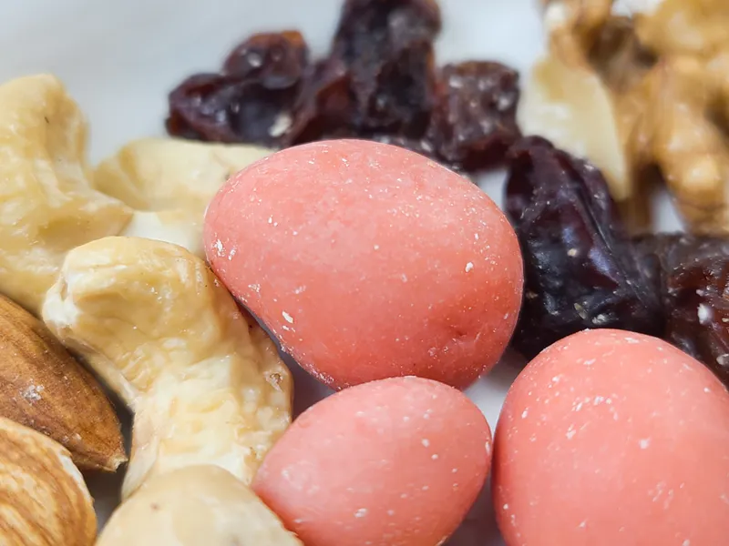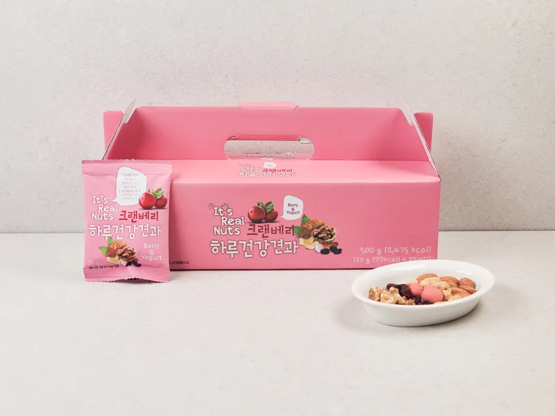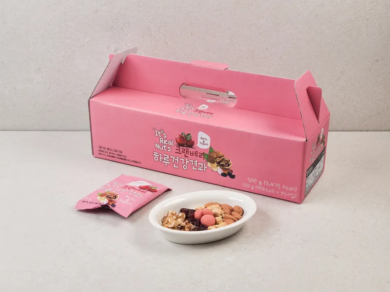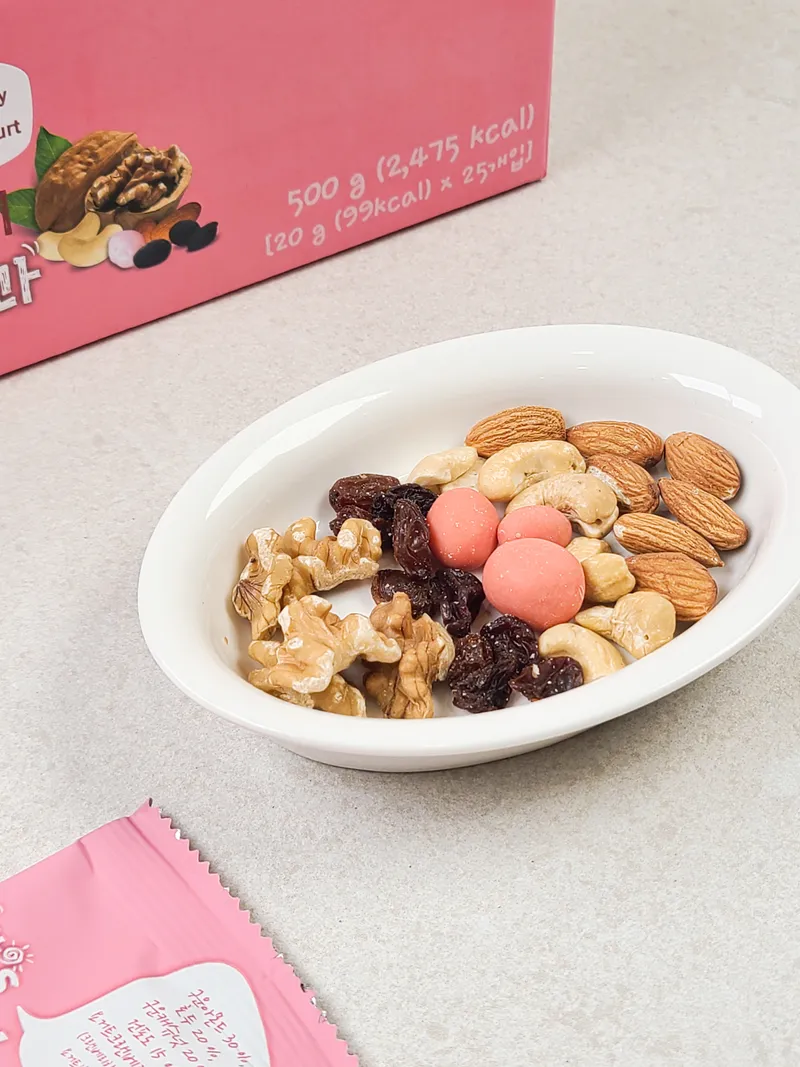 구운 아몬드, 호두, 구운 캐슈넛, 크랜베리 요거트볼, 건포도까지 총 5가지 재료를 골고루 담았어요. 5가지의 다채로운 맛과 식감을 느껴볼 수 있습니다.