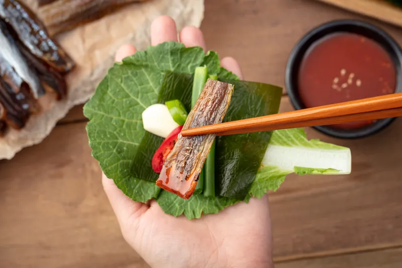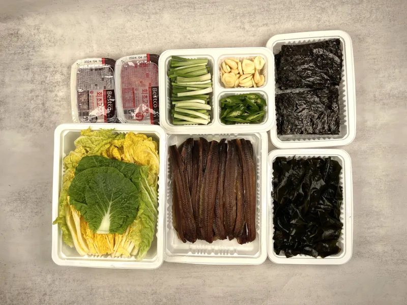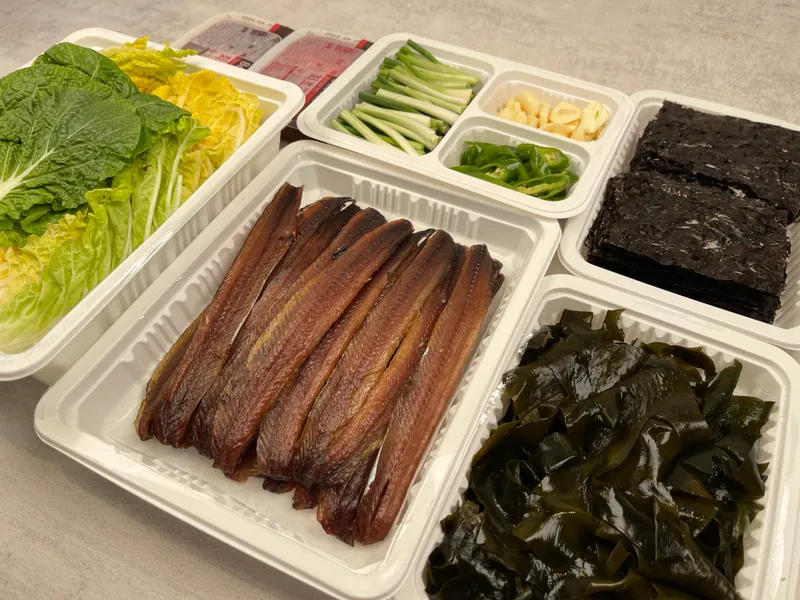 과메기, 돌미역, 김, 고추장, 쌈 채소, 마늘, 고추