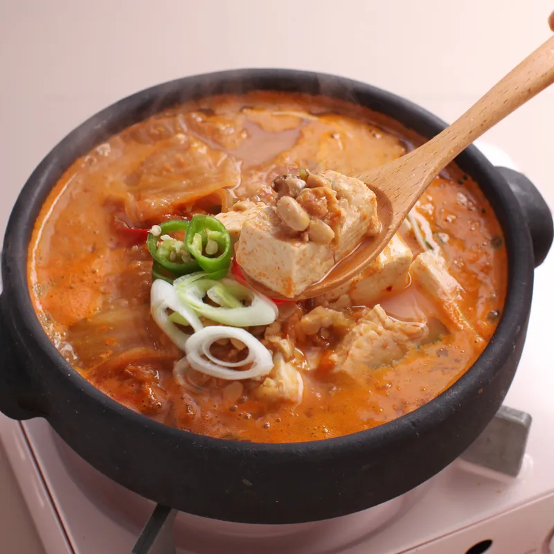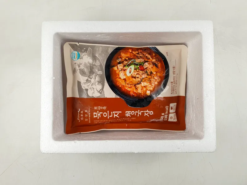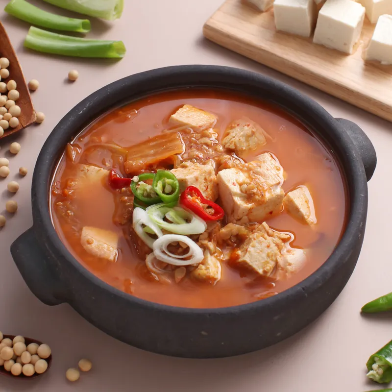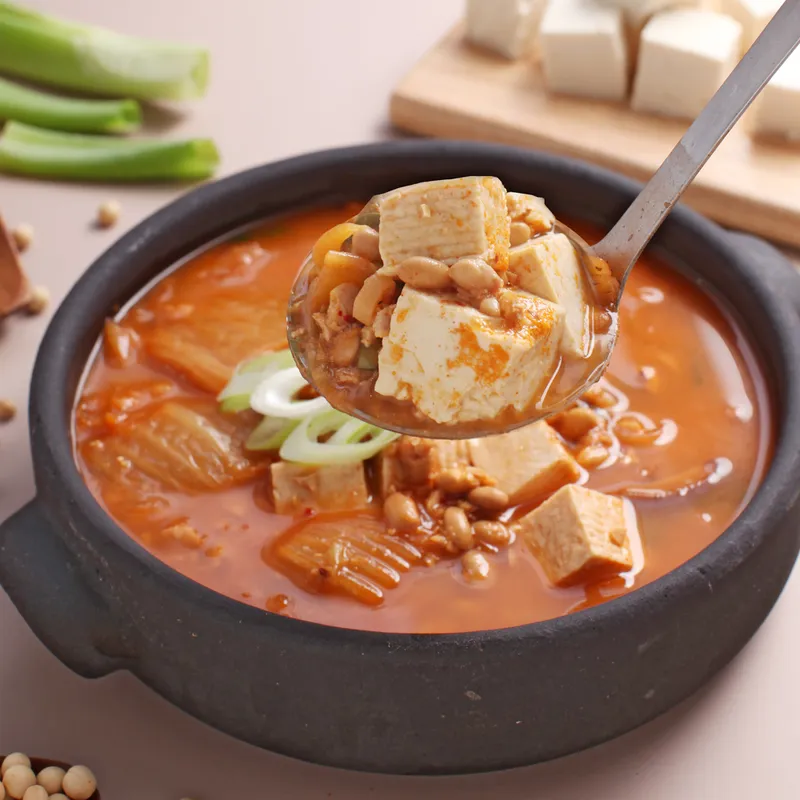 묵은지의 깊은 감칠맛과 청국장의 구수한 맛이 조화롭게 어우러져요. 전통 방식 그대로 발효시켜 더욱 깊은 맛을 느낄 수 있어요. 짜지 않고 적당히 간이 배어 든든한 한 끼 식사가 되어줘요.
