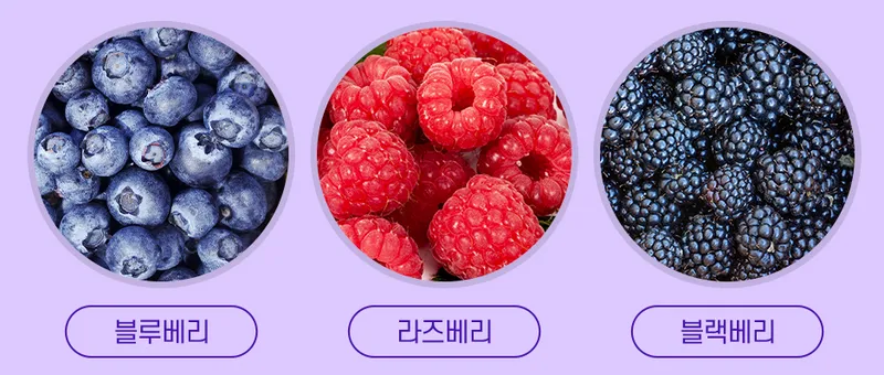3가지 베리를 통째로 갈아 넣은 진한 베리 주스로 간혹 섭취 시 베리 씨가 씹힐 수 있지만 원물에서 기인한 것으로 안심하고 섭취하셔도 됩니다.