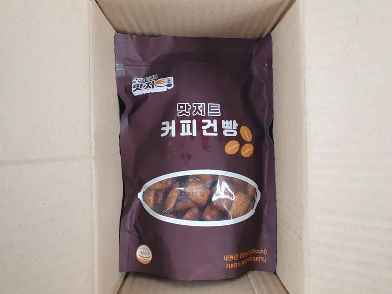 강릉 여행 가면 무조건 사 오게 된다는 커피 건빵이에요. 익숙한 간식, 건빵에 향긋한 커피향을 더했어요. 살짝 튀겨진 건빵의 바삭 달콤한 맛에 자꾸 손이 간답니다.