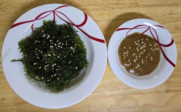 톡톡 터지는 바다포도라해 맛이 궁굼해서 주문했습니다. 처음에 그냥 먹어 보니 조금 짠듯해 물에 담구었다 같이 온 소스에 찍어 먹으니 맛있습니다. 소스와 바다포도가 잘 어울리네요~ 처음 접하는거 잘 안먹는 남편과 아들도 잘먹네요.
