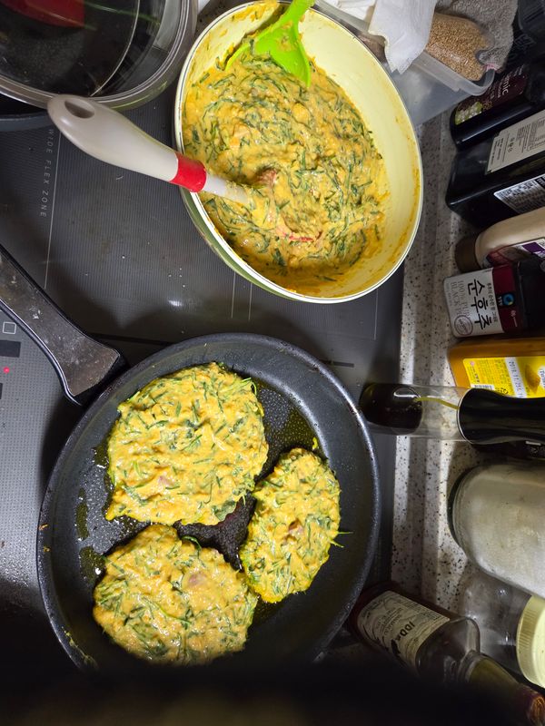 늙은 호박전이 처음 인데 호박맛이 진하고 좋아요. 반죽이 약간 질기는 하지만 부추를 넣고 맛있게 먹었어요.