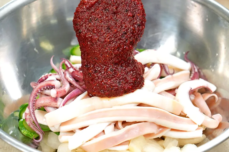 새콤달콤한 비법 양념을 듬뿍 더했어요.