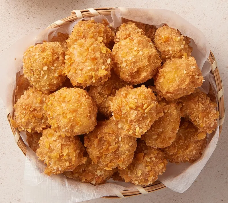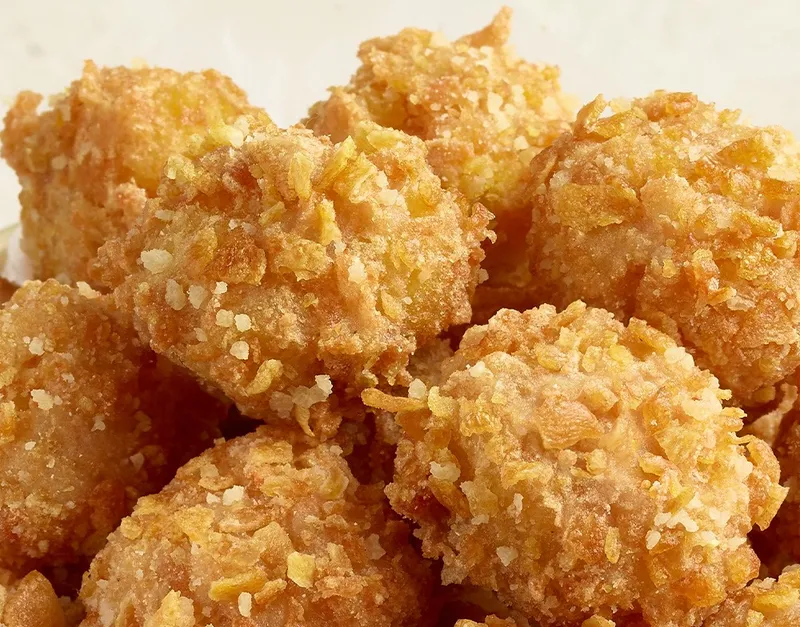 튀김에서 가장 중요한 건 바삭한 튀김 옷이죠. 고소하고 짭짤한 저희 튀김옷은 콘플레이크가 콕콕 박혀있어 더욱 바삭해요.