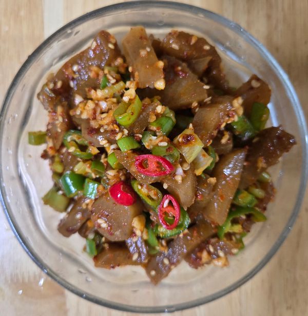 그냥 먹어도 괜찮지만 매운거 좋아해서 좀 작게 잘라 파.마늘.참기름.깨소금.고춧가루.고추넣고 조물조물 무쳤더니 괜찮네요.