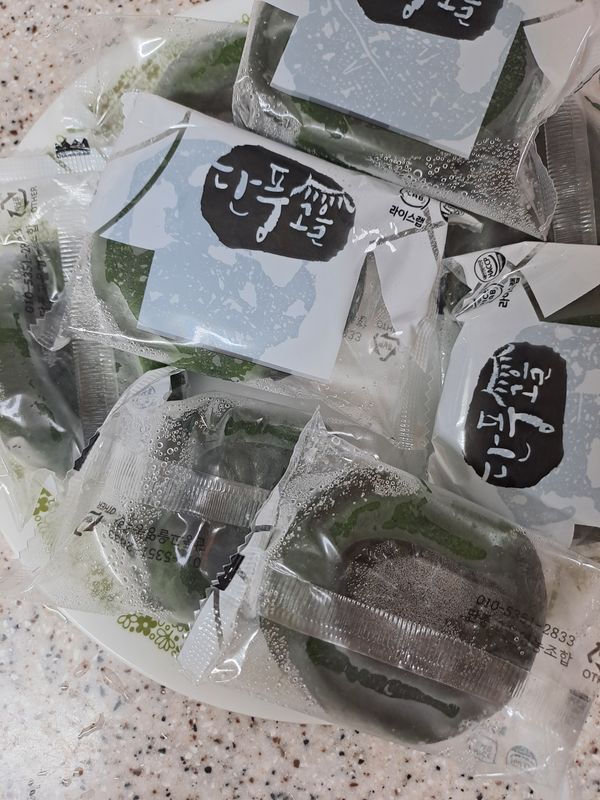 쑥이 많이 들어있어 쫄깃해요 냉장고에 넣으면 약간 굳어요 전자렌지에 30초 ㅡ1분 돌려 먹어요