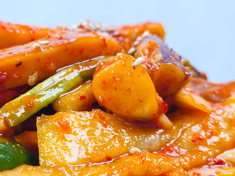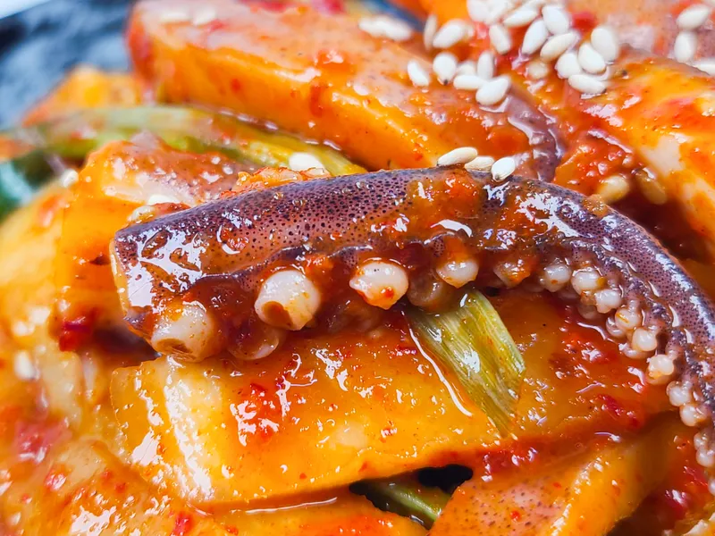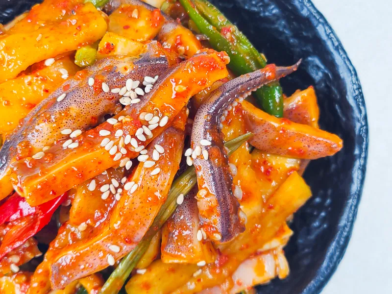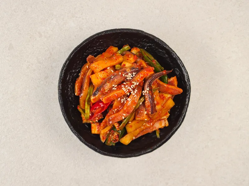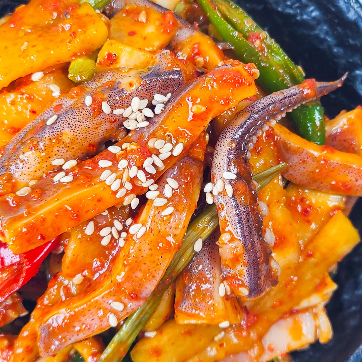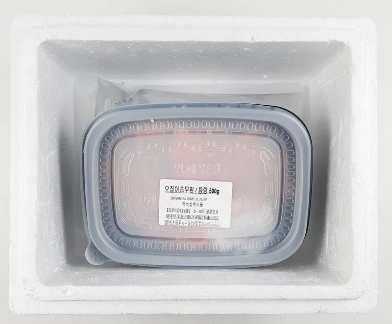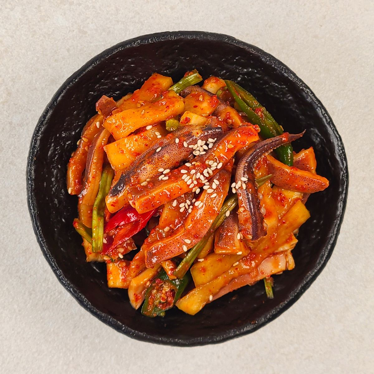 탱탱하게 삶아낸 국내산 오징어를 매콤 새콤하게 무쳐낸 초무침입니다. 식초의 상큼함과 고추장의 은은한 매콤함이 어우러져 한입만으로도 입맛이 확 살아나는 밥반찬이에요. 양념이 과하지 않아 부담 없이 즐길 수 있답니다.