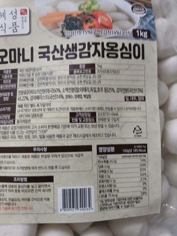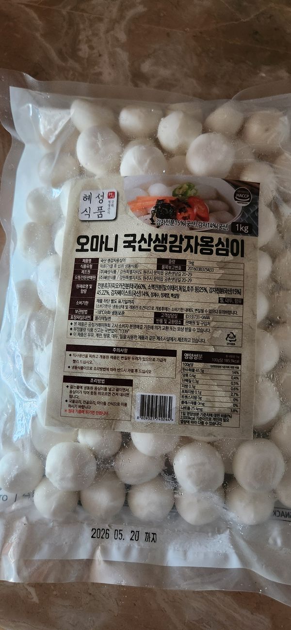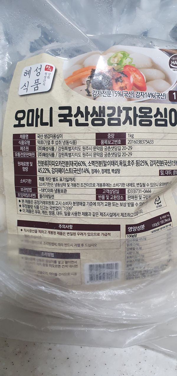 실망스러움.감자옹심이라고하여 옛날에먹어봤던 감자옹심인줄알고 감자떡과같이 친정엄마도주문해드리고같이주문했는데 ㅠㅠ. 주문시 제대로확인못한 잘못도있지만 타피오카전분이들어가서인지 쫄깃한 찰떡이라할까.너무쫄깃해서 먹는내내 잘못시켰네하며 꼭꼭싶어먹었다. 팔순어머님 드실때 어렵겠구나싶고. 순수 감자옹심이를 먹고싶었는데. 떡볶기 밀떡먹는느낌. 남은거 떡볶기처럼 해먹어야할듯.옥수수 감자떡은 맛나게 먹음