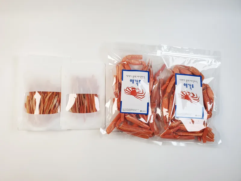 100% 국내산 영덕 홍게(붉은 대게)의 다리살로 만든 해각포입니다. 제철 시기에 어획한 살 꽉 찬 홍게를 맛있게 건조시켰답니다. 첫 식감은 바삭바삭하고 오래 씹을수록 고소한 홍게의 맛을 제대로 느껴볼 수 있어요!