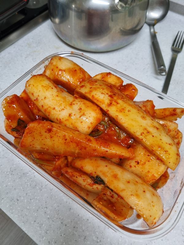 양념이 너무 덕지덕지 안아서 깔끔하고요 간도 딱좋고 안매워요 아삭해요 갓담근거 좋아해서 익기전부터 열심ㅎㅣ 먹고있는데 익으면 시원할꺼같아여 라면이랑 먹으면 굳일듯 근데 아쉬운건 여기도 김장무로 담그는듯 여기뿐만 아니라 총각김치 유목을 엄청했는데 제가원하는 손가락 만한 달랑무로는 안담그시나봐여 ㅠ 다른곳도... 아무래도 하나하나 씻으려면번거러워서 그런거 같기도 하구 손질안된 손가락만한 달랑무 팔긴 하던데 직접만들기 도전 해봐야할듯 ㅋ 암튼 맛은 있어요 ~