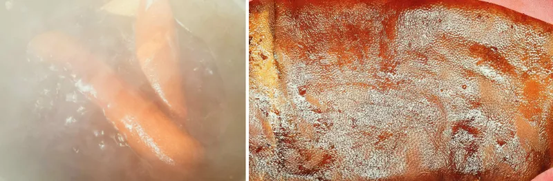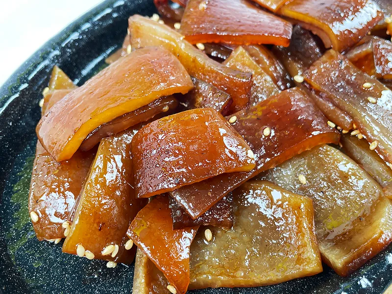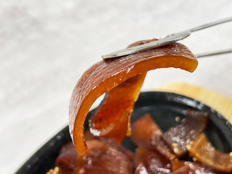 탱글탱글한 식감, 감칠맛, 달콤함, 고소함을 한 번에 맛볼 수 있는 돼지껍데기입니다. 과일, 채소, 한방 약재를 사용하여 깊은 맛을 더했습니다.