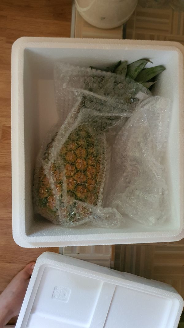 사진과 같이 박스에 꽉차게 뽁뽁이로 덮어서 보내왔네요. 파인애플 잡는법을 조회후 바로 집도에 들갔고, 한입베어 물어보고는 깊은 단맛을 느낍니다. 전혀 시지도 않고 부드러운 달콤함만 남네요. 그리고 저만 그런지 몰겠는데 끝맛에 코코넛 맛도 느껴집니다.