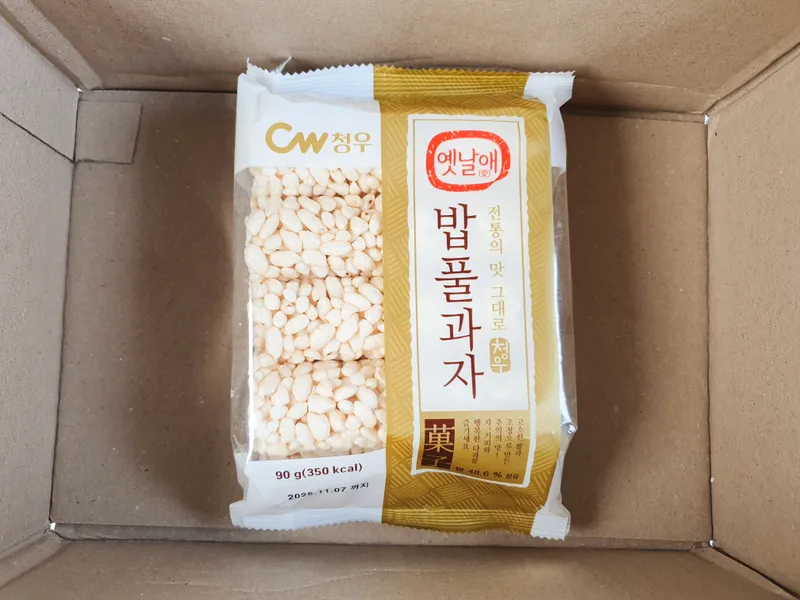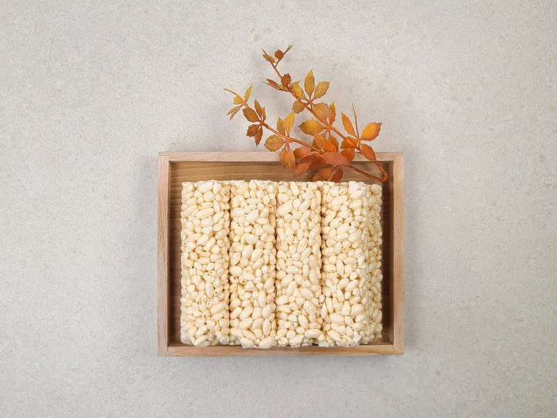 추억과 전통을 담은 우리 과자, 밥풀(쌀) 과자를 준비했어요. 바사삭 부스러지며 조청의 달콤함과 쌀의 고소한 풍미가 입안을 가득 채워주죠. 무심코 먹다보면 어느새 몽땅 사라져버리는 마법같은 맛을 선사해요!