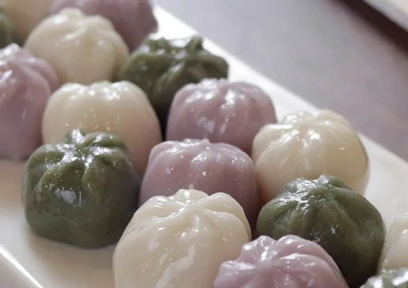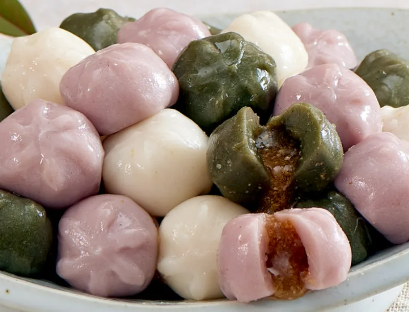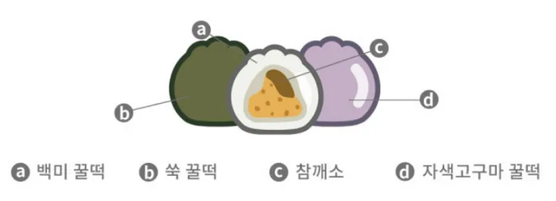 쫄깃하고 달콤한 꿀떡이에요. 백미, 쑥, 자색고구마로 3가지 색을 냈어요. 속에는 참깨소를 넣어 고소~함이 입안 가득 차올라요.