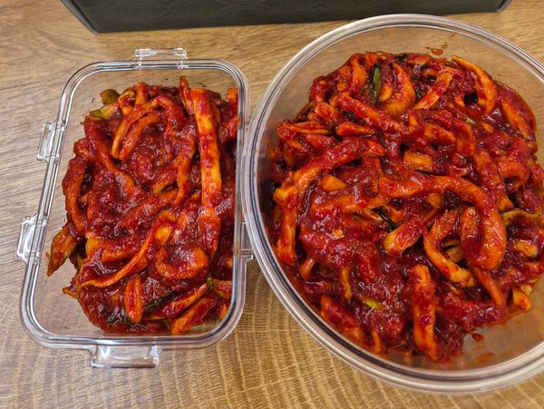 여전히 맛있네요. 받자마자 국 한가지랑 무말랭이 같이 맛있게 먹고 담에는 반찬 없을때 계란 하나 부쳐 비벼먹기 하면 딱일듯. 양념이 많이 묻어있는데 별로 안짜고 그리 달지도 않아요.